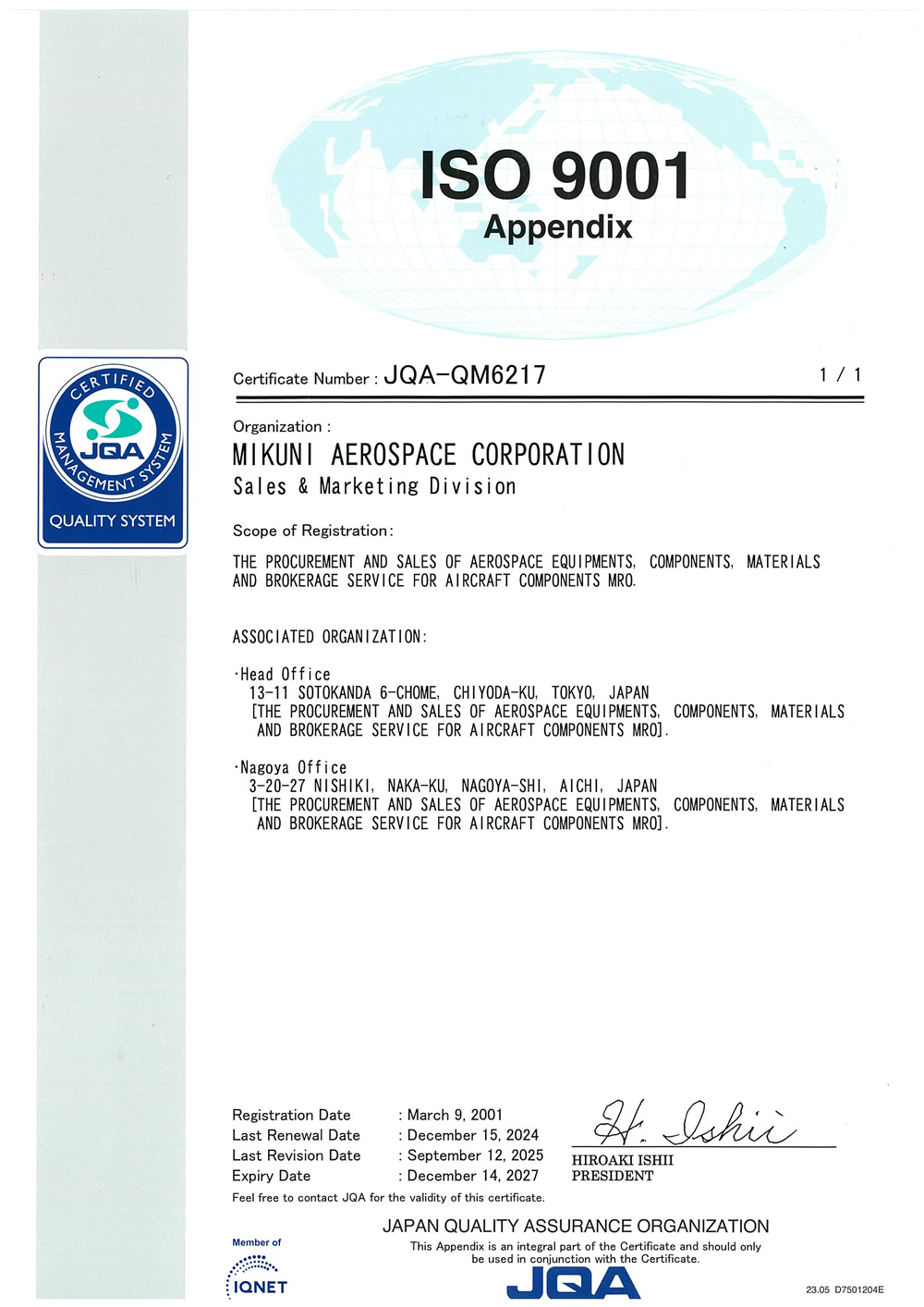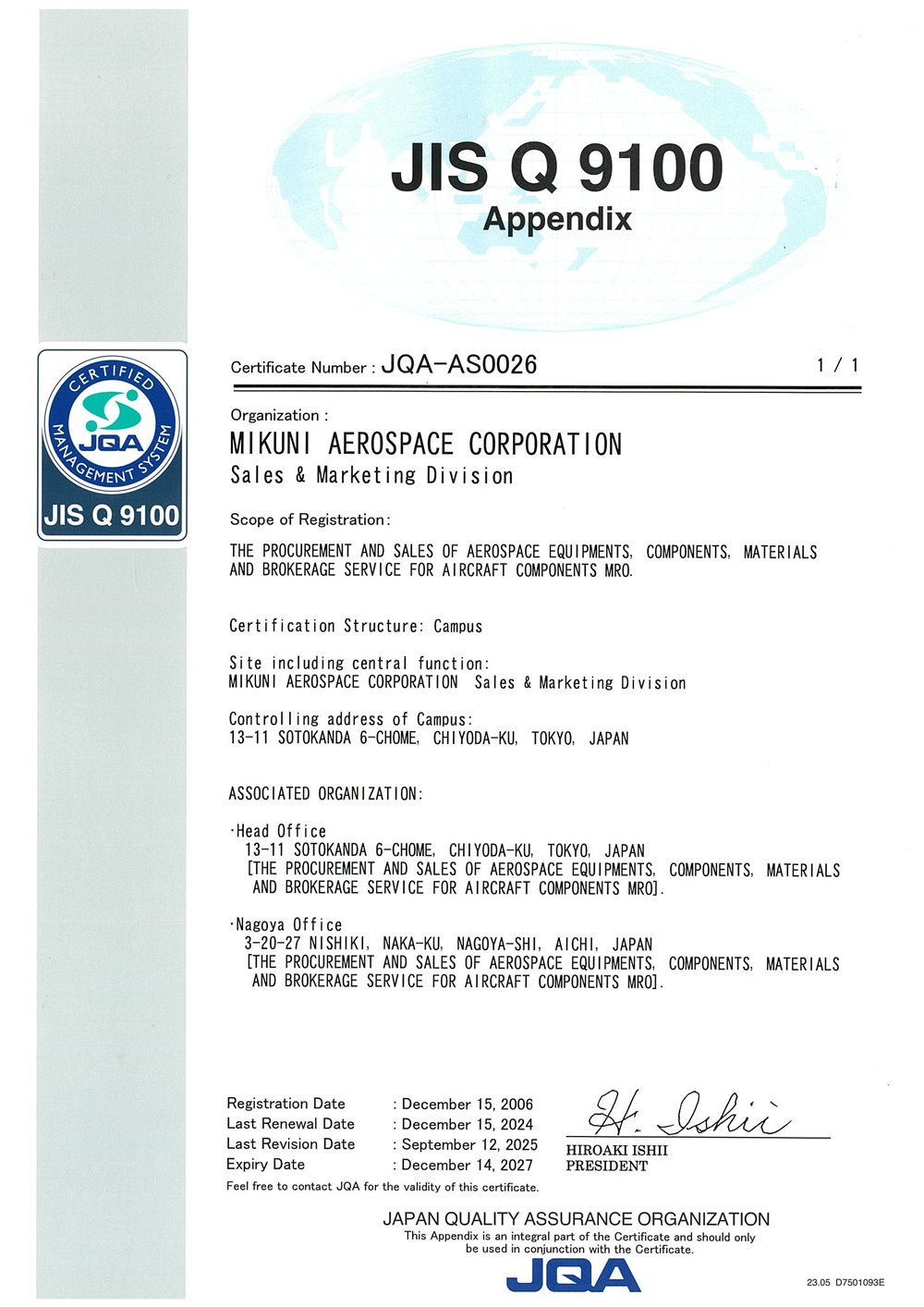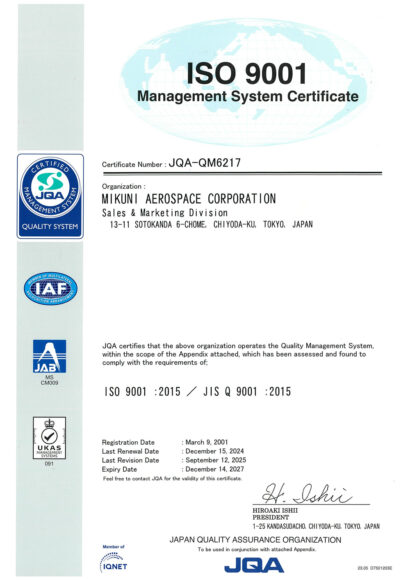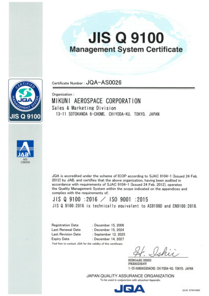Mikuni Aerospace Corporation has obtained ISO 9001:2015 and JIS Q 9100:2016 (technically equivalent to AS9100D and EN9100:2018) certification for quality management systems required by organizations in the aviation, space, and defense fields.