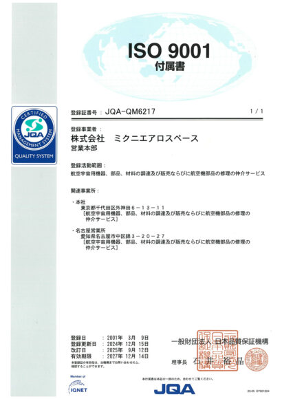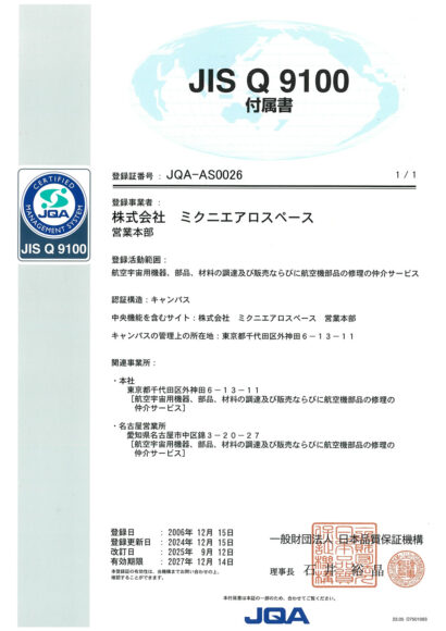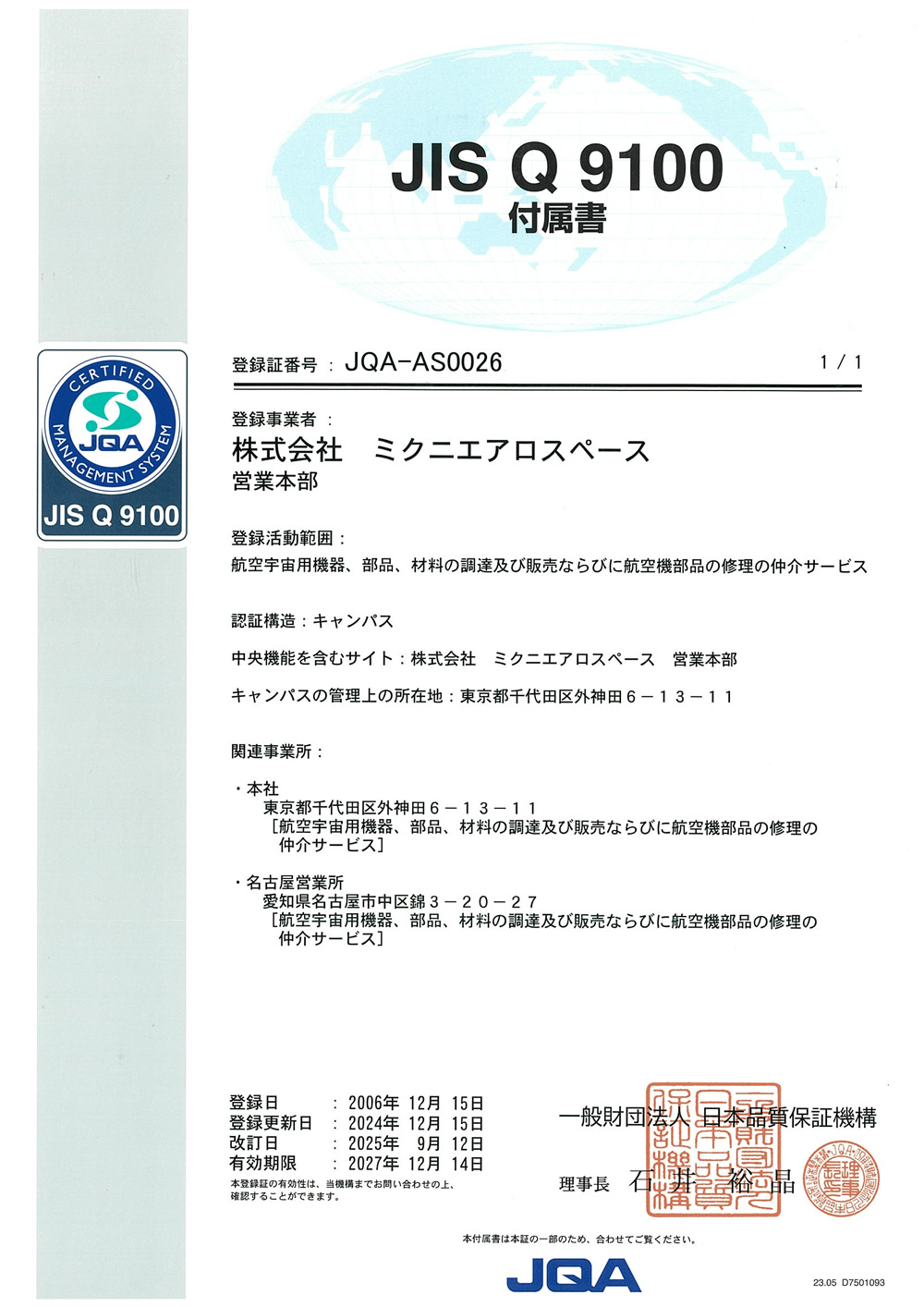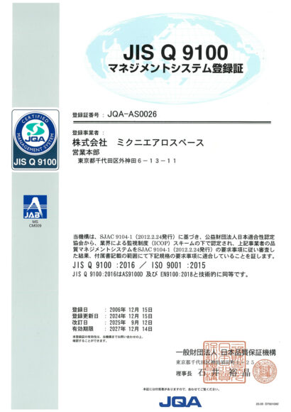 株式会社ミクニエアロスペースは、航空、宇宙及び防衛分野の組織に求められております品質マネジメントシステムISO 9001:2015及びJIS Q 9100:2016(AS9100D 及びEN9100:2018 と技術的に同等)の認証を取得しております。